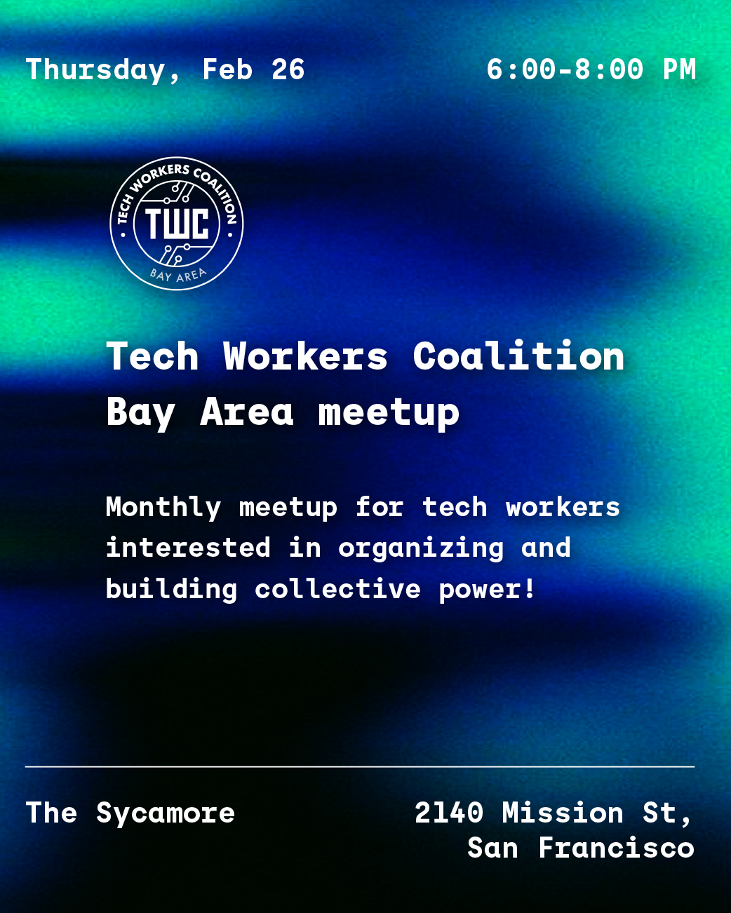 We are a coalition of workers in and around the tech industry, labor organizers, community organizers, and friends. We work in solidarity with existing movements towards social justice, workers' rights, and economic inclusion.